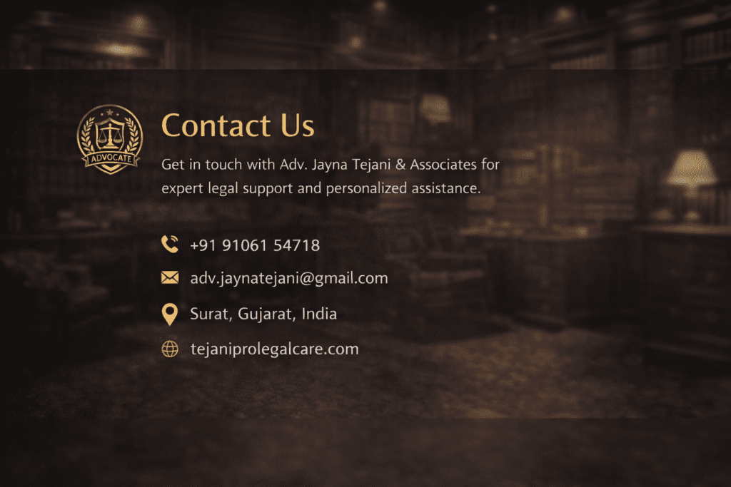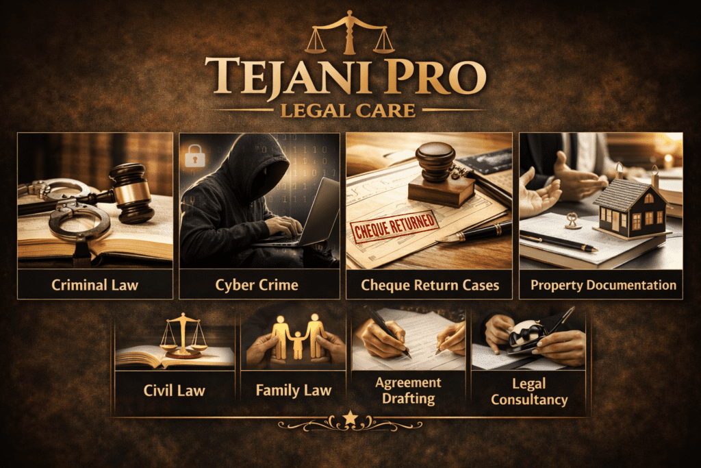 Tejani Pro Legal Care delivers expert, trustworthy legal solutions tailored to your needs. Specializing in Criminal Law, Cyber Crime, Cheque Bounce Cases, Property Documentation, Civil Law, Family Law, and Legal Consultancy, we simplify complex legal matters with clarity and precision.