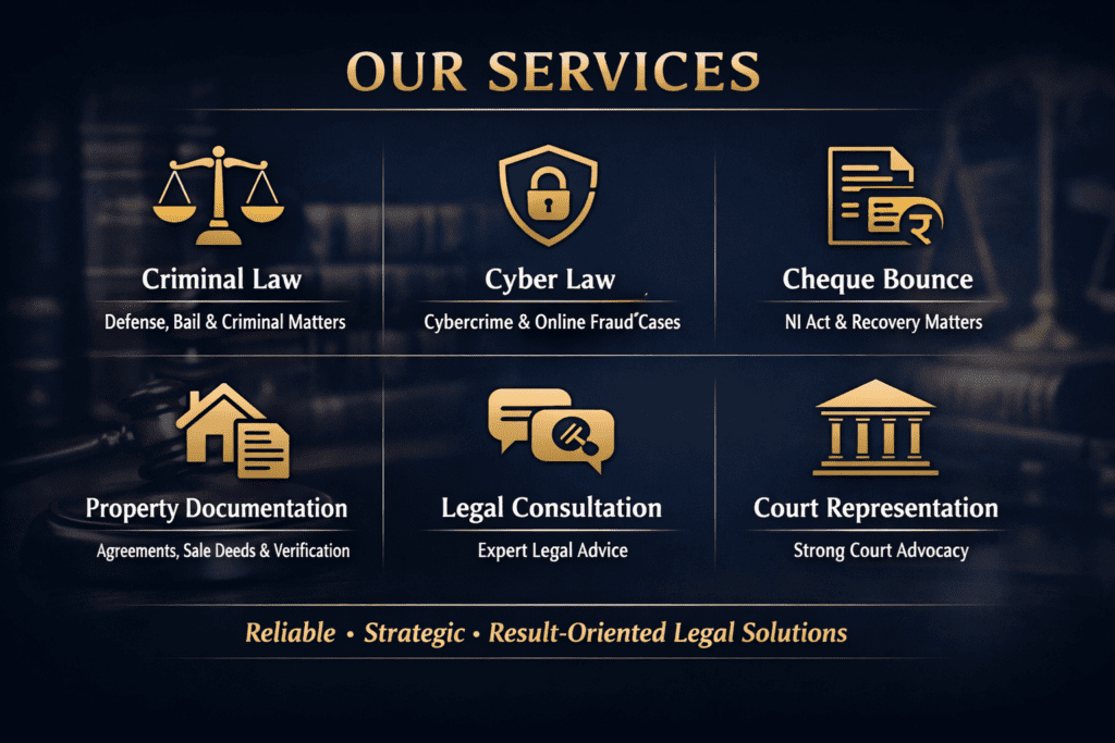 We provide expert legal services in Criminal Law, Cyber Law, Cheque Bounce Cases, Property Documentation, and Legal Consultation.